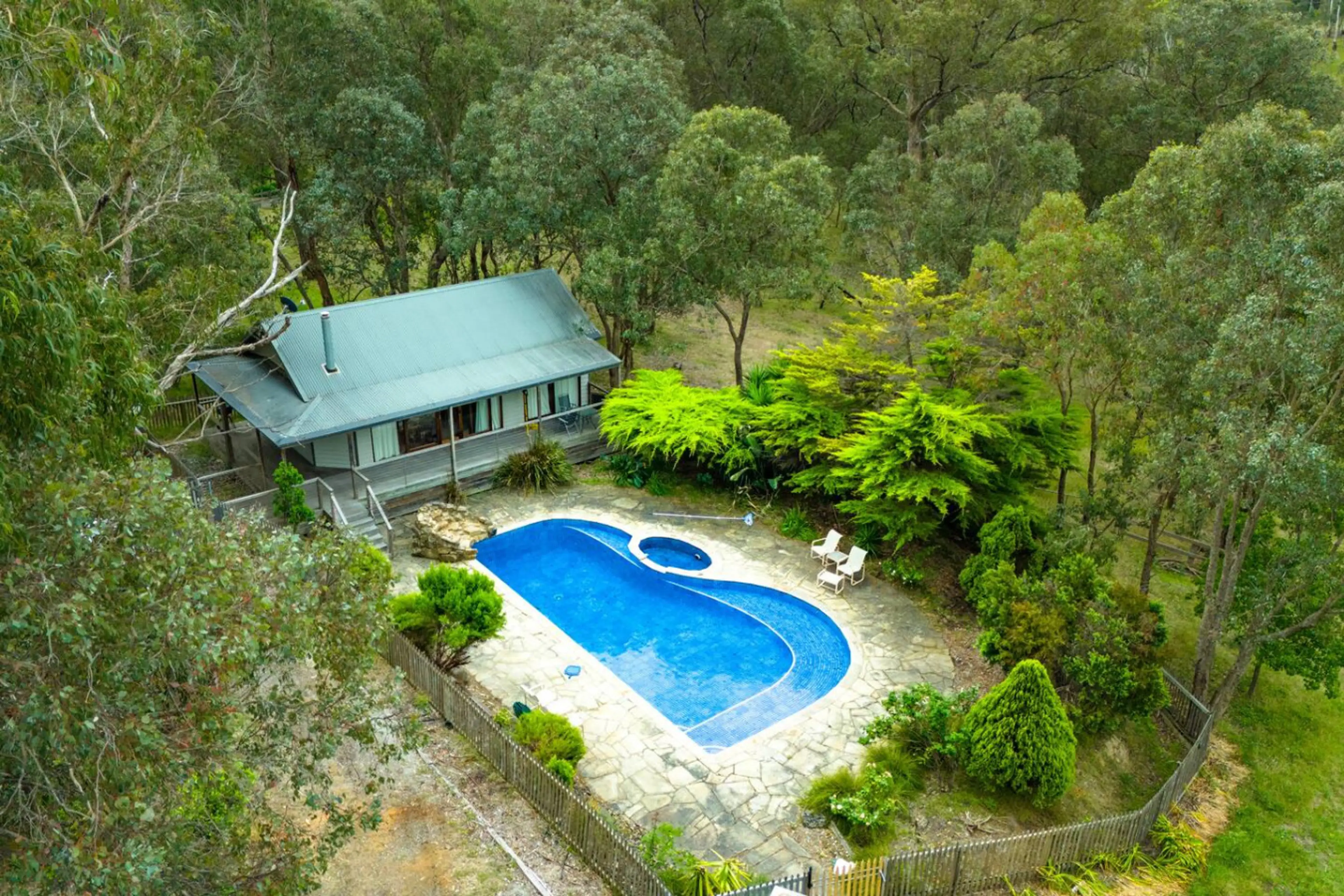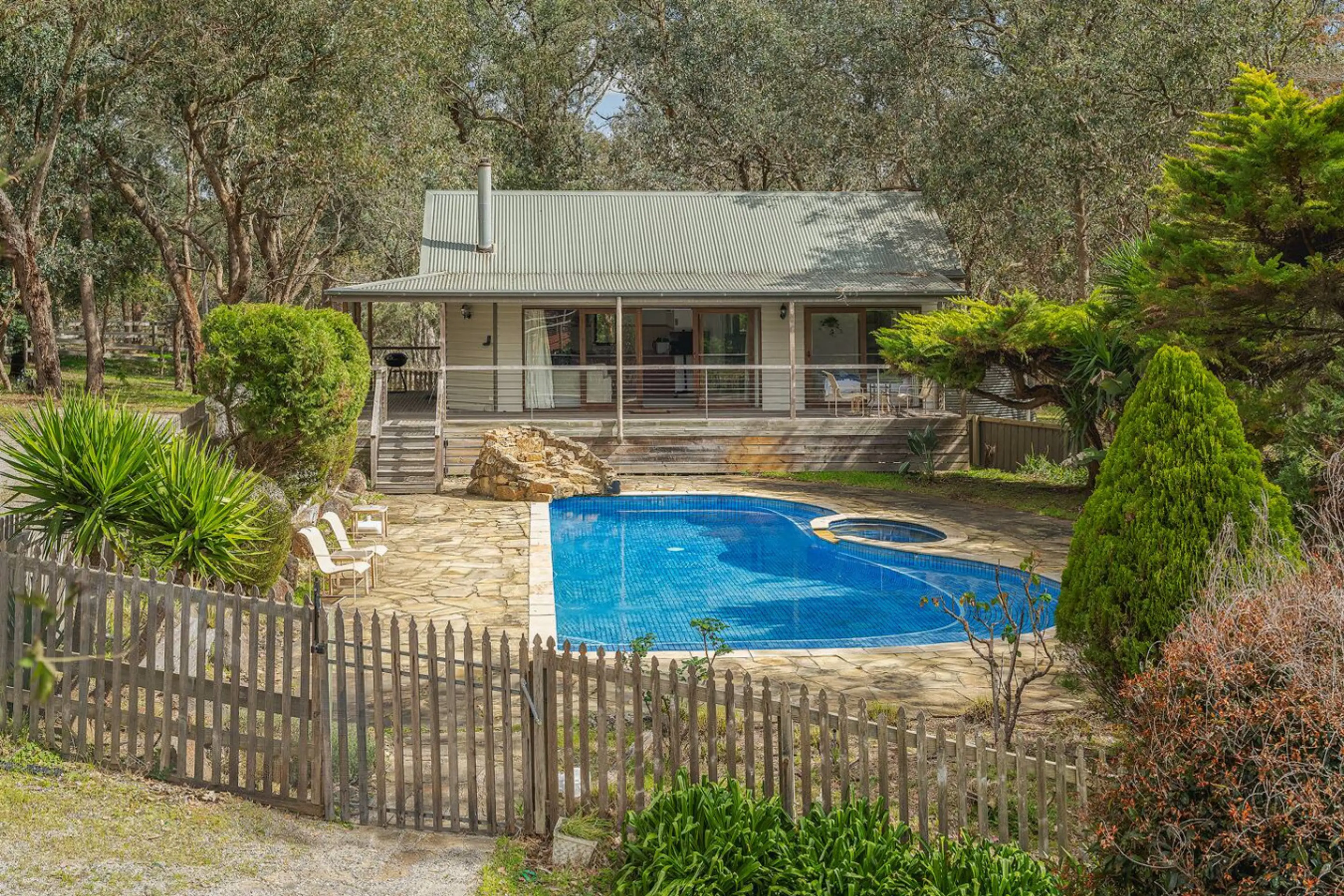 Escape to our serene one-bedroom retreat with floor-to-ceiling windows, private deck, pool and tranquil forest views. The cottage features open-plan living, a fully equipped kitchen, split system heating/cooling, and a queen bedroom. Relax by the fireplace, unwind on the deck or explore nearby War...